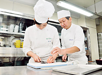 本校では、朝や放課後など授業がない時間帯(8:00~18:00)でも、清潔で機能的な実習台を完備した実習室を開放しています。その日実習したことを繰り返しおさらいしたり、自分で調理にチャレンジしてみるなど、技術を磨くためにいつでも自由に活用することができます。もちろん、わからないことはすぐに教員が対応し、技術の向上をサポートしています。